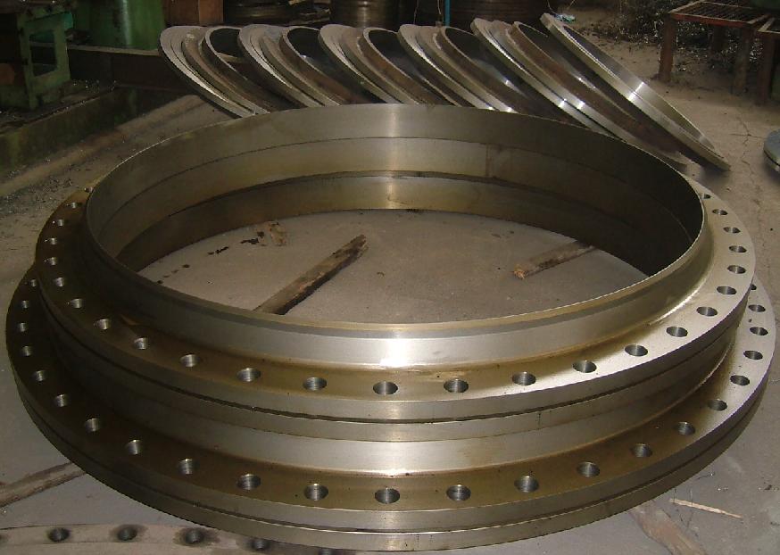 大型法蘭采用的工藝之中有一種是中板割制然后卷制而成。這樣中間的部分我們還可以做成其它的產品。如盲板或者小一號的法蘭等。還有一種工藝就是拼接,在單邊特別寬或者說是厚度薄的情況之下,更多的是采用的拼接來生產大型法蘭產品的。通常是4拼的產品,也就是說一整個的法蘭由4個90度完成。